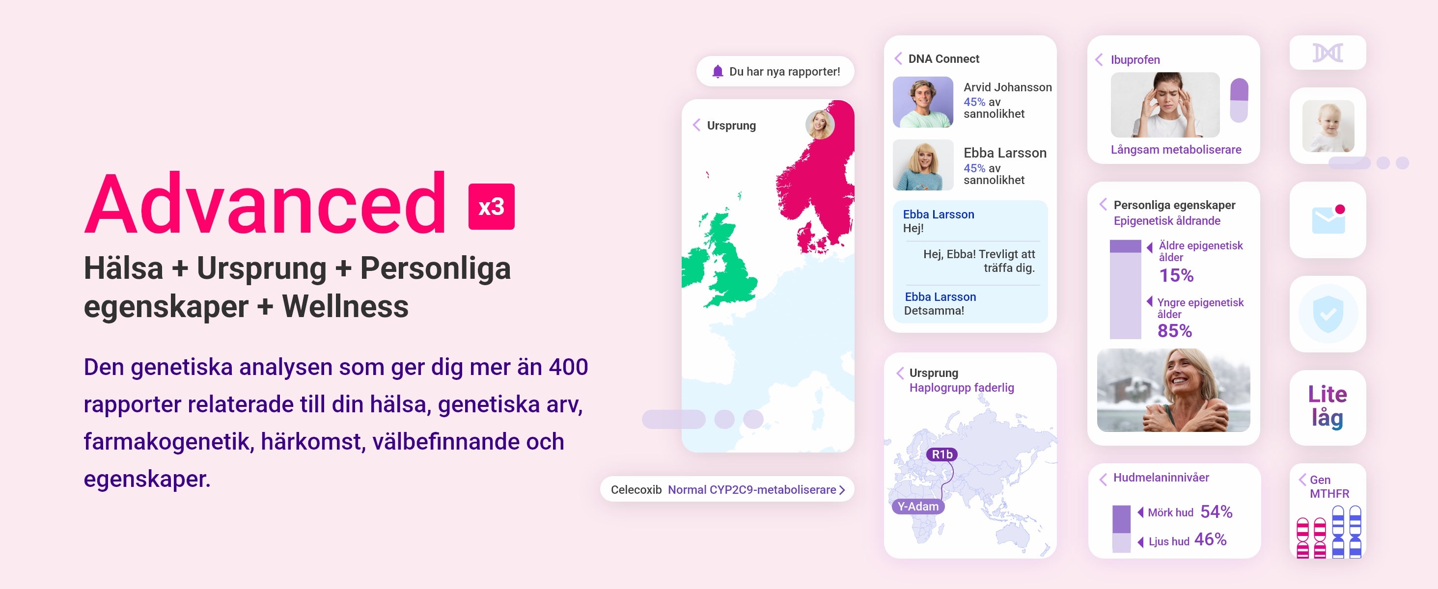 Family Advanced আপনাকে কম দামে তিনটি Advanced DNA পরীক্ষা উপভোগ করার সুযোগ দেয়। আপনার জেনেটিক্স পুরোপুরি এবং বিস্তারিতভাবে অন্বেষণ করার জন্য যা কিছু প্রয়োজন! এই প্যাকটি কেনার পর, আপনি তিনটি কিট পাবেন এবং আপনাকে একই সময়ে সব স্যালাইভা নমুনা ল্যাবরেটরিতে পাঠাতে হবে।