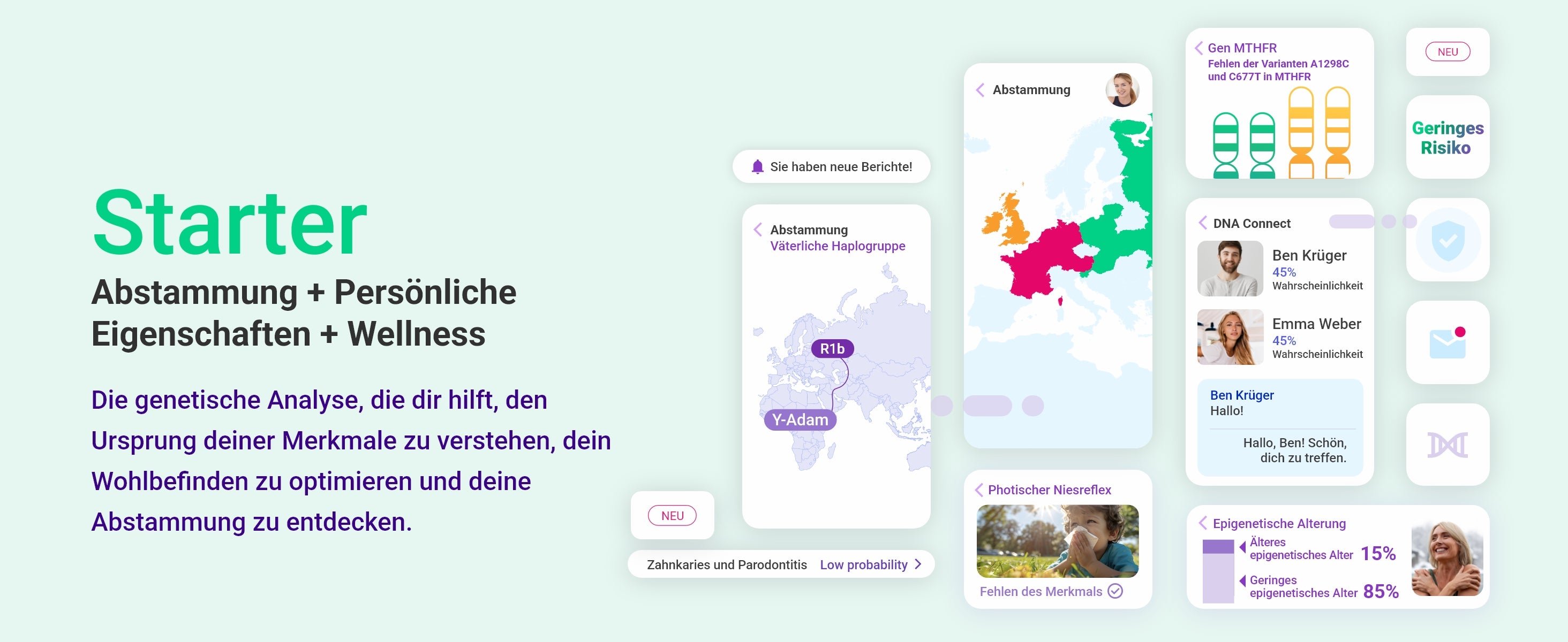 - Berichte jederzeit erweiterbar!: Beginne mit unserer Starter-Reihe und wenn du möchtest, kannst du ohne erneute Probenabgabe jederzeit auf unseren DNA-Test Advanced upgraden, um Zugang zu Hunderten zusätzlicher genetischer Berichte über deine Gesundheit zu erhalten.