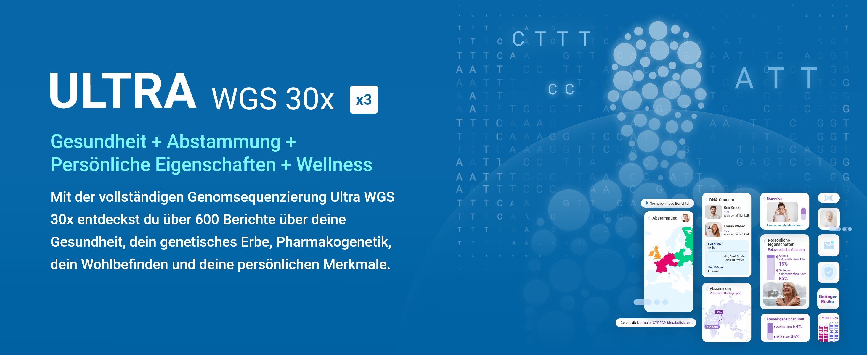Erwerbt eure genetische Ultra-Analyse (WGS -30x) Family, UL, um alle Informationen zu erhalten, die eure Gene euch mitteilen können. Wenn ihr die Sequenzierung in der Familie oder mit Freunden durchführen möchtet, ist die Family-Option die optimale Wahl.