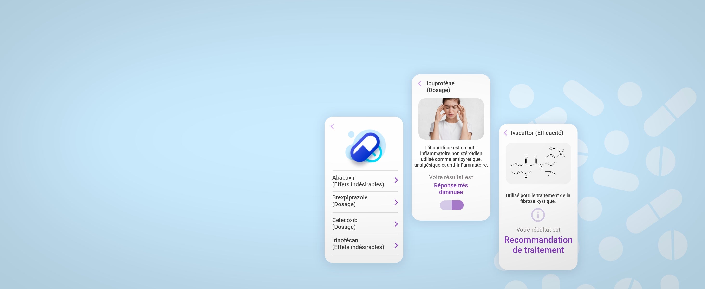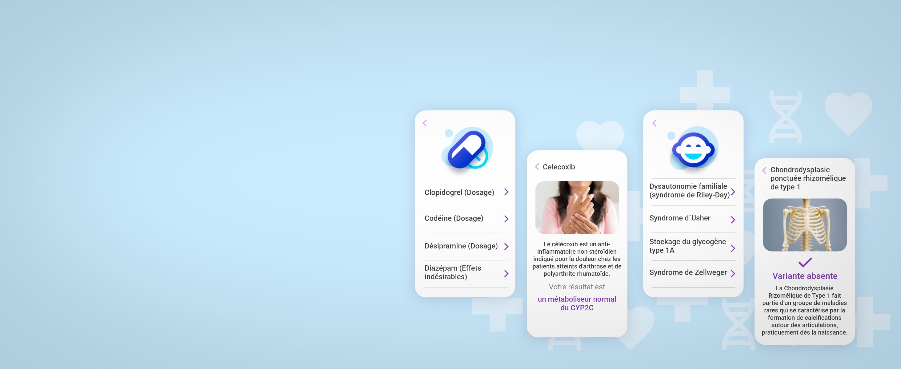 Apprenez comment votre corps réagit à plus de 95 médicaments courants. Grâce à l'analyse pharmacogénétique, vous saurez quelle est votre compatibilité avec les médicaments et différents traitements médicaux, permettant à votre médecin de personnaliser votre traitement pour éviter les effets secondaires et améliorer son efficacité.