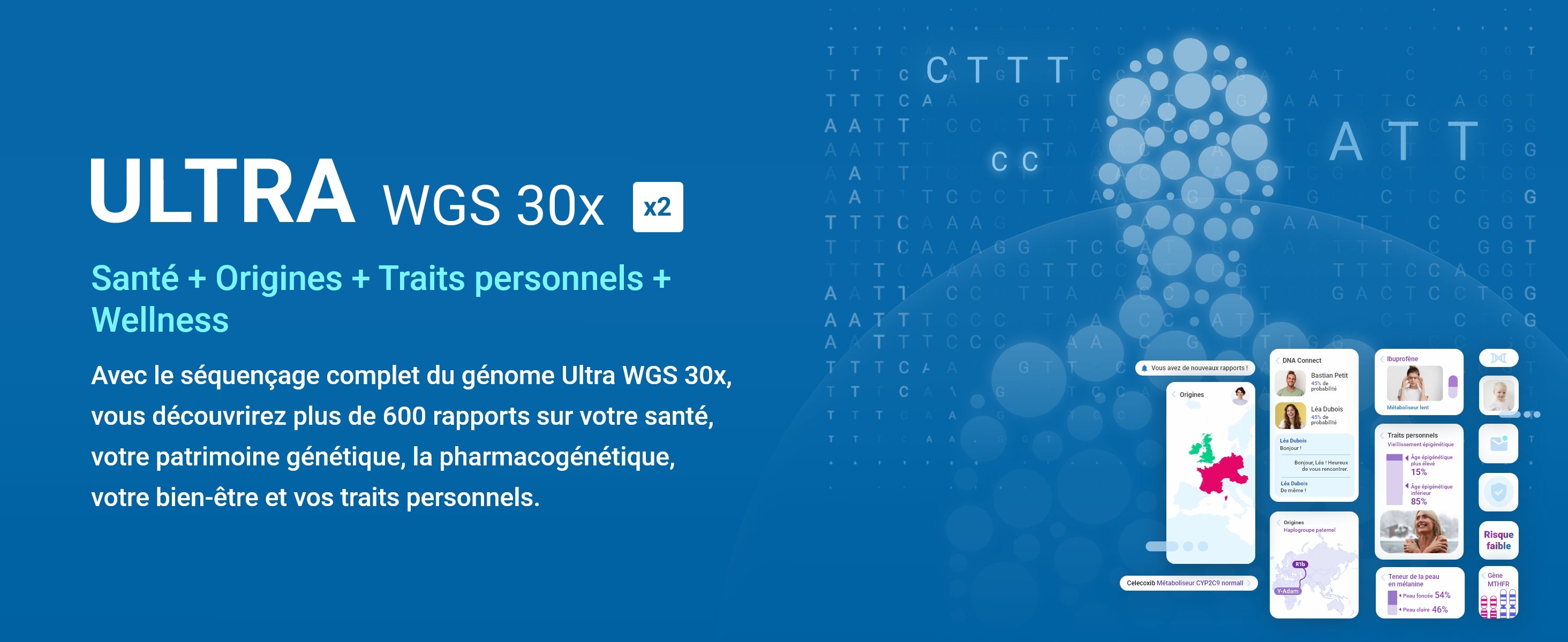 Procurez-vous votre analyse génétique Ultra (WGS -30x) Duo, UL, pour obtenir toutes les informations que vos gènes ont à vous révéler. Si vous envisagez de réaliser le séquençage en compagnie d’une autre personne, l’option Duo est le choix optimal.