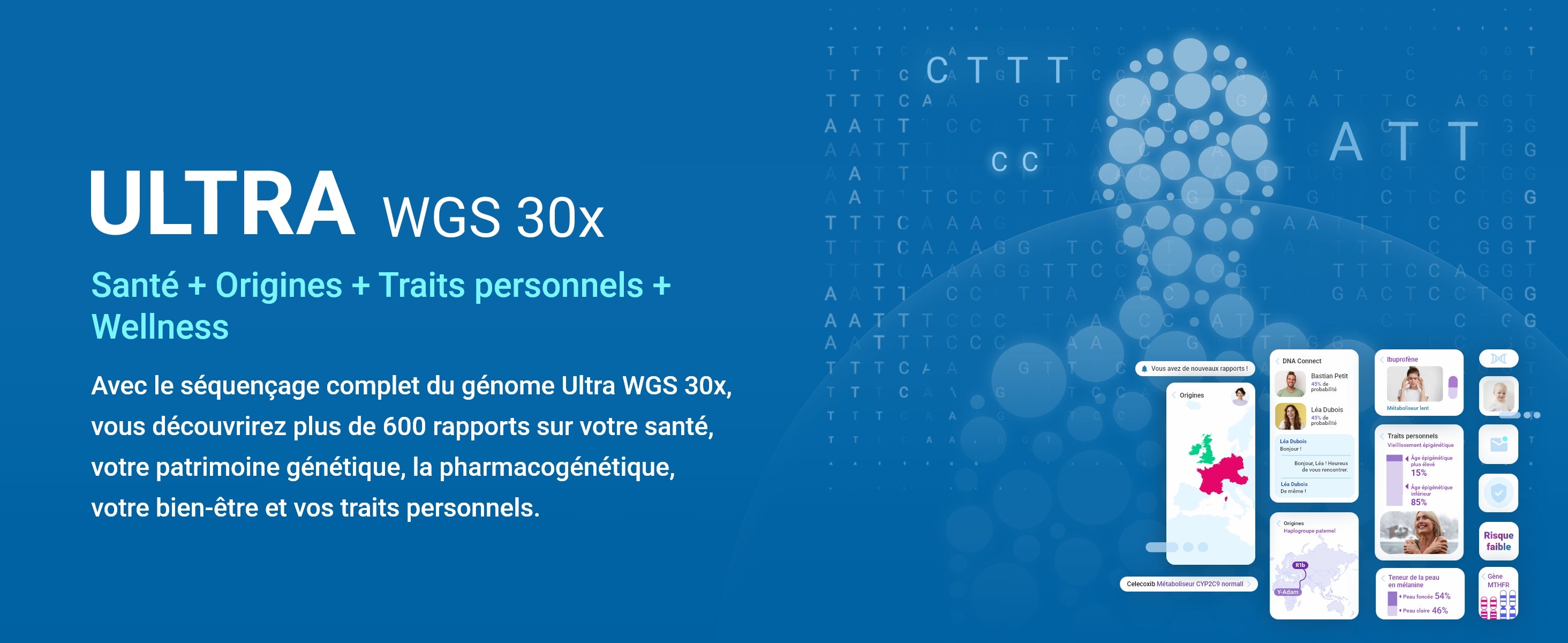 Acquérez votre analyse génétique Ultra (WGS -30x), UL, pour obtenir toutes les informations que vos gènes ont à vous dire.