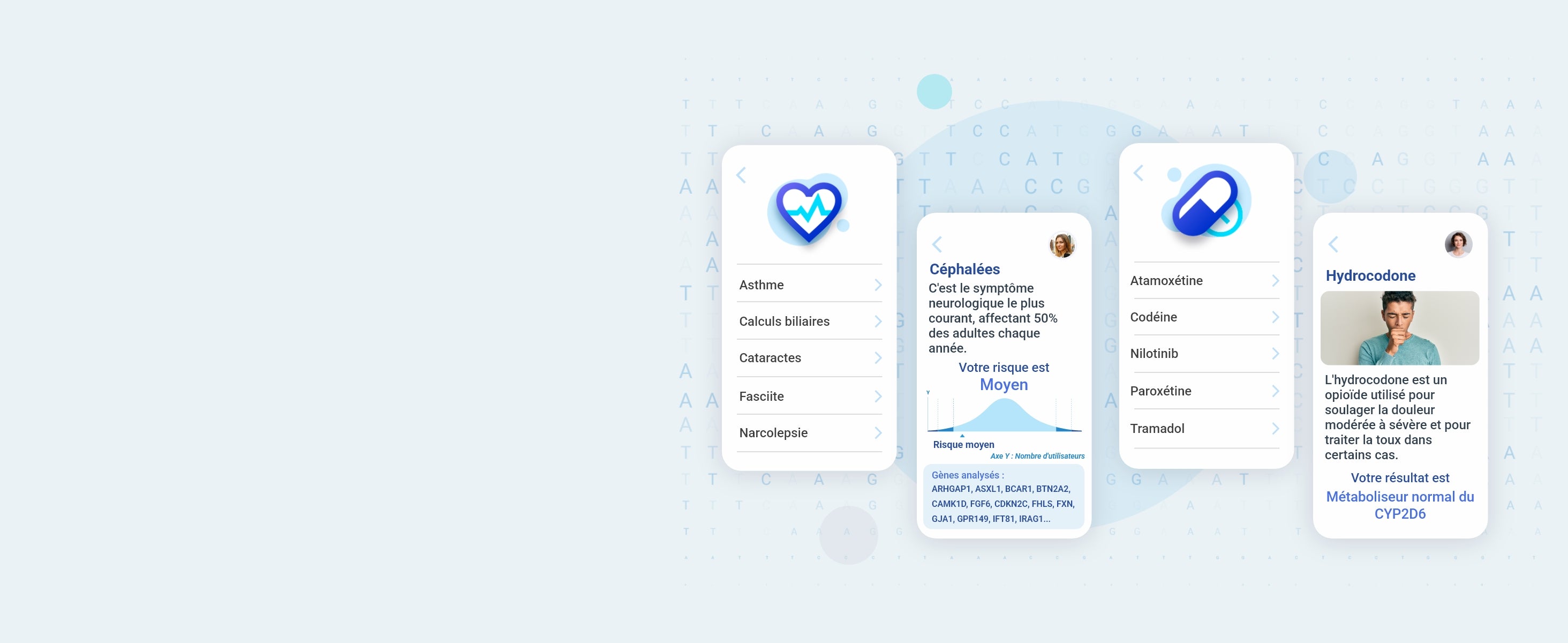 Votre vulnérabilité génétique à des conditions de santé, si vous êtes porteur de conditions héréditaires et votre compatibilité pharmacologique avec de nombreux médicaments. Nous indiquerons les variantes analysées, qu'elles soient structurelles ou non, et ajouterons des gènes exclusifs de l'analyse Ultra.