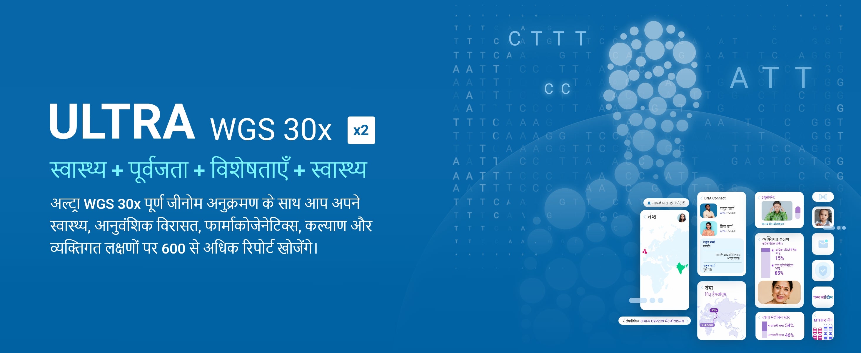 स्वास्थ्य स्थितियों के लिए आपकी जेनिटिक संवेदनशीलता, क्या आप आनुवंशिक रोगों के वाहक हैं और विभिन्न दवाओं के लिए आपकी फार्माकोलॉजिकल संगतता। हम विश्लेषित किए गए वेरिएंट्स, संरचनात्मक या गैर-संरचनात्मक, आपको बताएंगे और हम आपको अल्ट्रा विश्लेषण से एक्सक्लूसिव जीन देंगे।