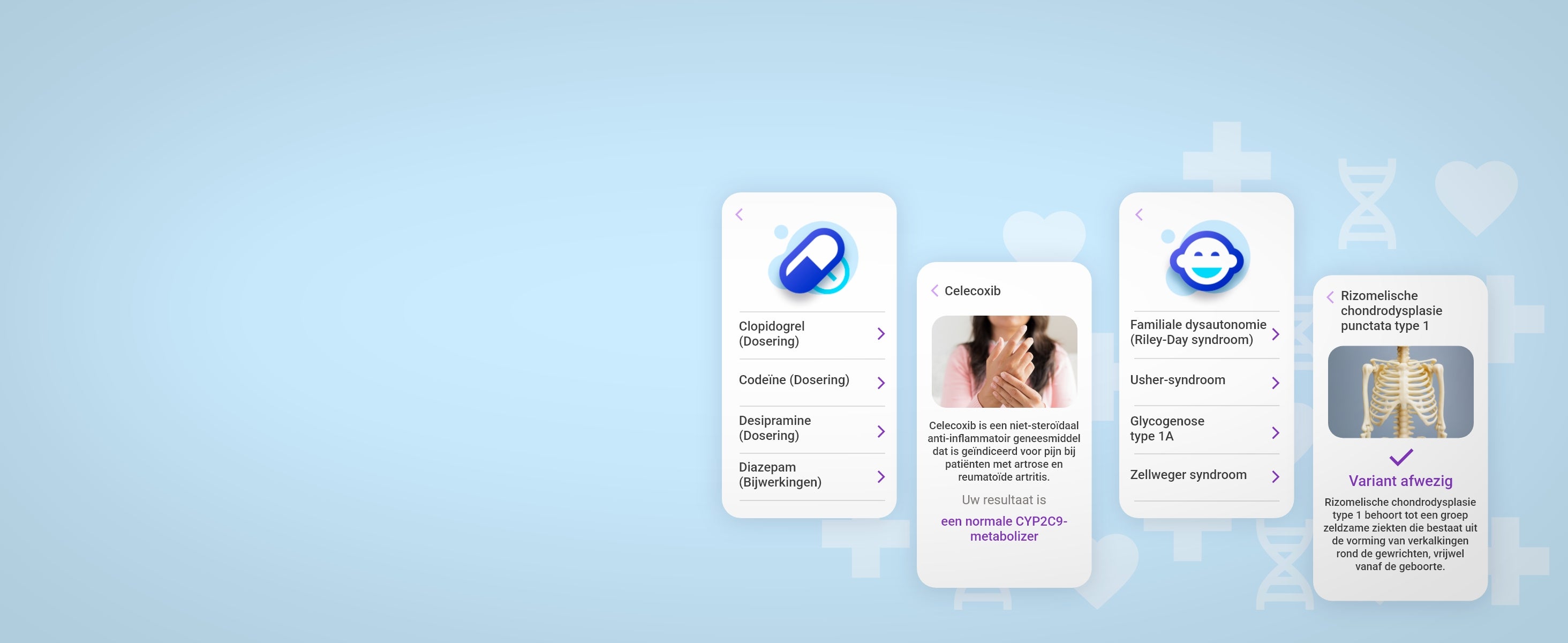 Leer hoe je lichaam reageert op meer dan 95 veelvoorkomende medicijnen. Dankzij farmacogenetische analyse weet je welke compatibiliteit met medicijnen en verschillende medische behandelingen je hebt, waardoor je arts je behandeling kan personaliseren om bijwerkingen te voorkomen en de effectiviteit te verbeteren.