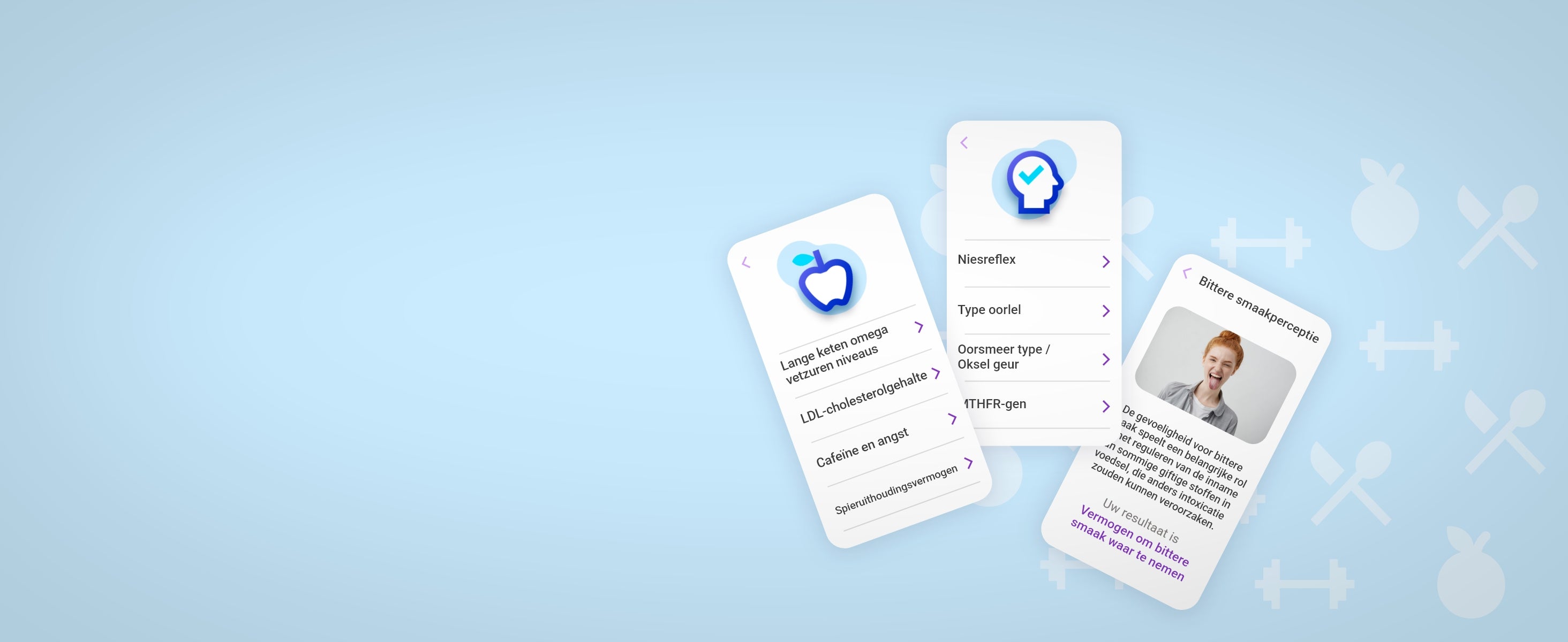 Ontvang gedetailleerde informatie over hoe je genetica invloed heeft op belangrijke aspecten van je voeding, zoals je stofwisseling van voedingsstoffen en je reactie op verschillende stoffen. Analyseer ook hoe het je fysieke prestaties en herstel beïnvloedt, en help jezelf je fysieke activiteit op een gepersonaliseerde manier te verbeteren. In totaal ontvang je meer dan 50 rapporten over je welzijn en fysieke prestaties.