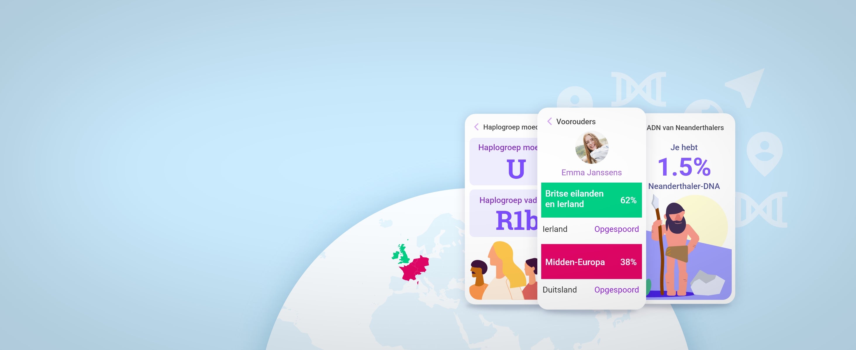Ontdek je wortels met de analyse van je ancestrale DNA. De Duo Advanced van tellmeGen stelt je in staat om tientallen etnische groepen te verkennen en je resultaten te vergelijken met een wereldwijde database. Ontdek ook je haplogroepen, subhaplogroepen en je percentage Neanderthaler DNA.
