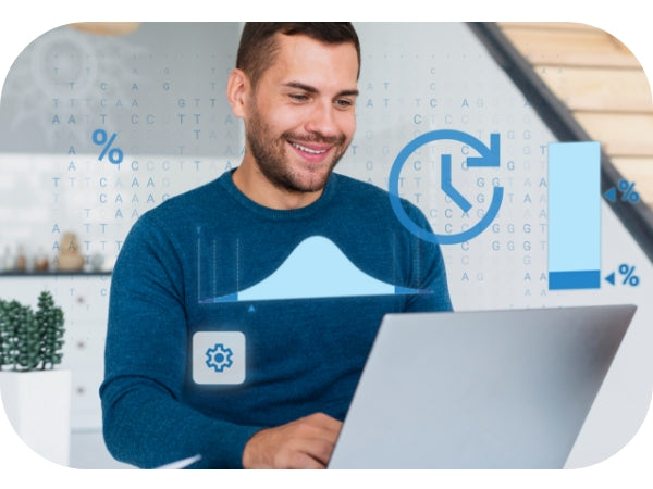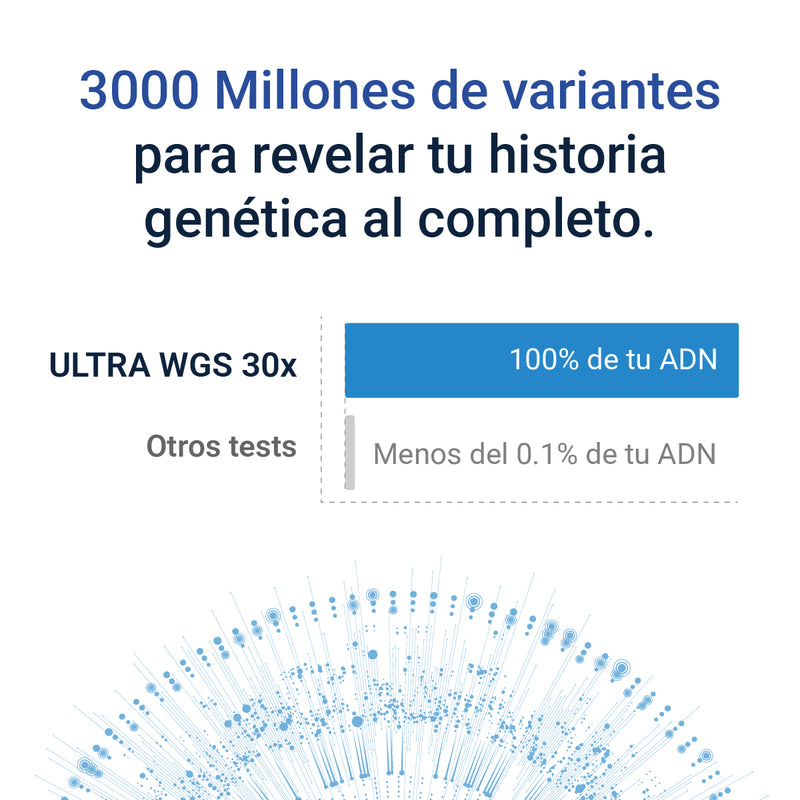 Ten produkt sekwencjonuje cały genom, dostarczając najpełniejszych informacji i uzupełniając nasze pozostałe produkty. Podczas gdy nasze analizy genotypowania badają 13 milionów wariantów, nasze masowe sekwencjonowanie analizuje 3 miliardy wariantów. Zobaczycie nie tylko własne warianty genetyczne, ale także rzadkie warianty trudne do wychwycenia przy użyciu chipu oraz duże warianty strukturalne, takie jak powtórzenia tandemowe i rearanżacje. Uzyskacie dostęp do dwóch sekwencjonowań, po jednym dla każdego użytkownika.