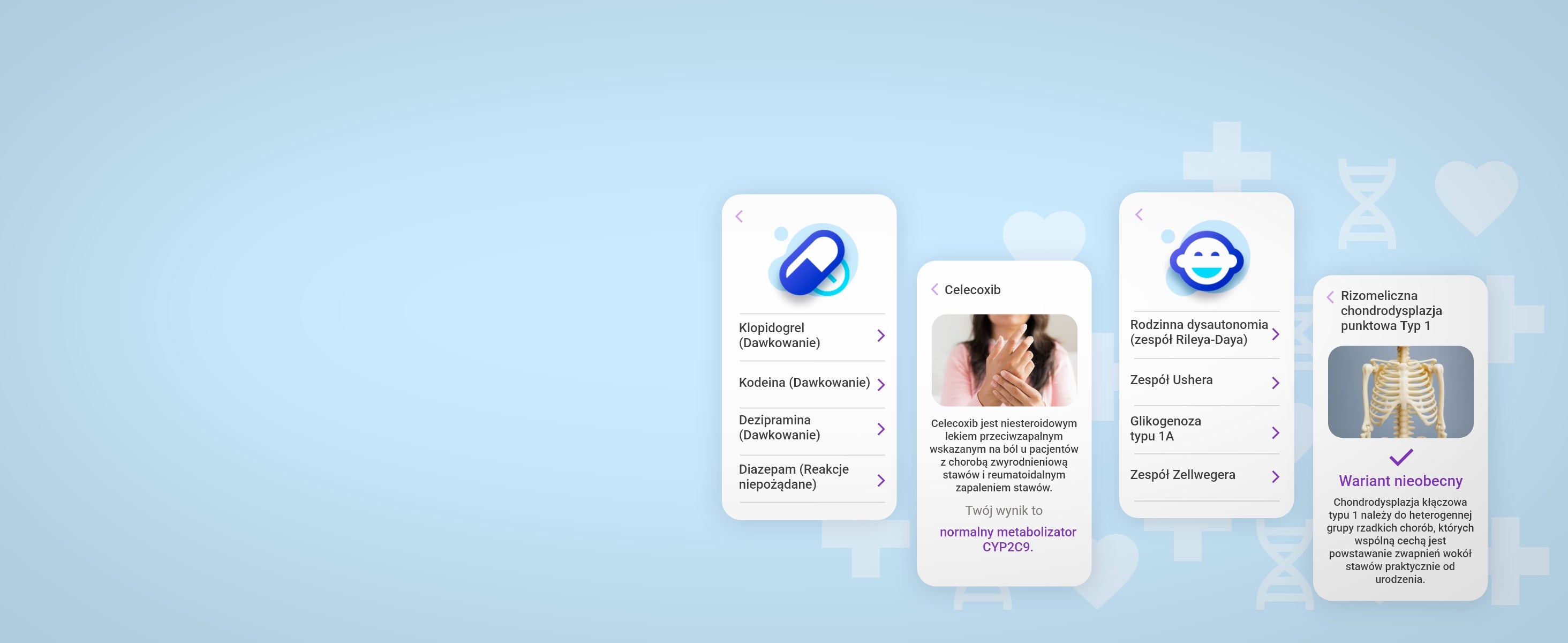 Dowiedz się, jak Twoje ciało reaguje na ponad 95 popularnych leków. Dzięki analizie farmakogenetycznej dowiesz się, jaka jest Twoja kompatybilność z lekami i różnymi terapiami medycznymi, co pozwoli Twojemu lekarzowi dostosować leczenie, aby uniknąć działań niepożądanych i poprawić skuteczność leczenia.
