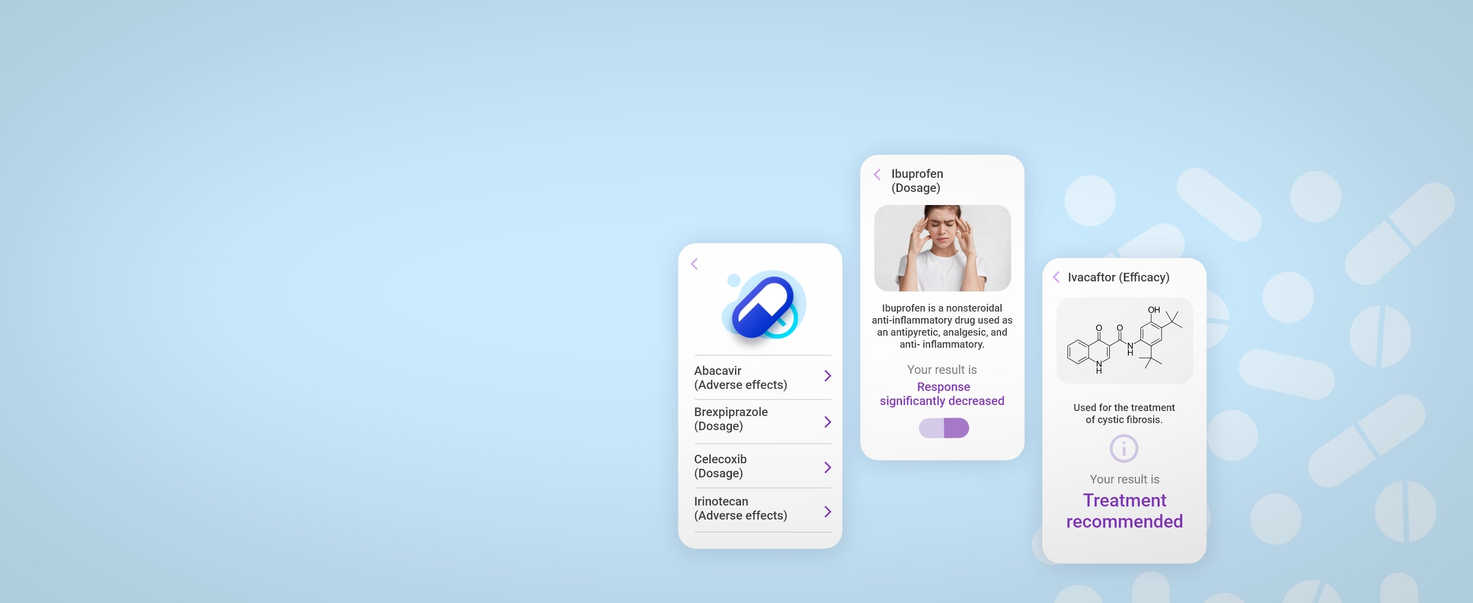 Узнайте, как ваше тело реагирует на более 95 распространенных медикаментов. Благодаря фармакогенетическому анализу вы узнаете свою совместимость с лекарствами и различными медицинскими лечениями, что позволит вашему врачу персонализировать лечение, избегая побочных эффектов и улучшая его эффективность.