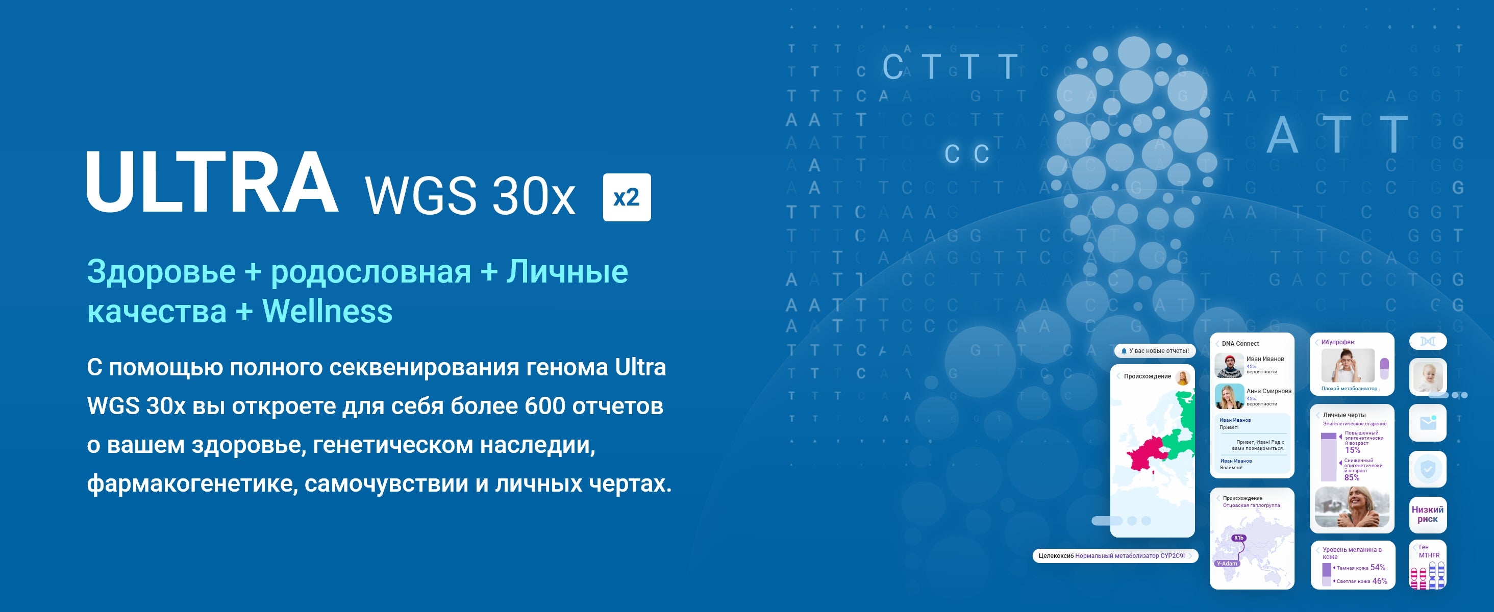 Приобретите ваш генетический анализ Ultra (WGS -30x) Duo, UL, чтобы получить всю информацию, которую могут рассказать ваши гены. Если вы планируете проходить секвенирование вместе с другим человеком, вариант Duo — оптимальный выбор.